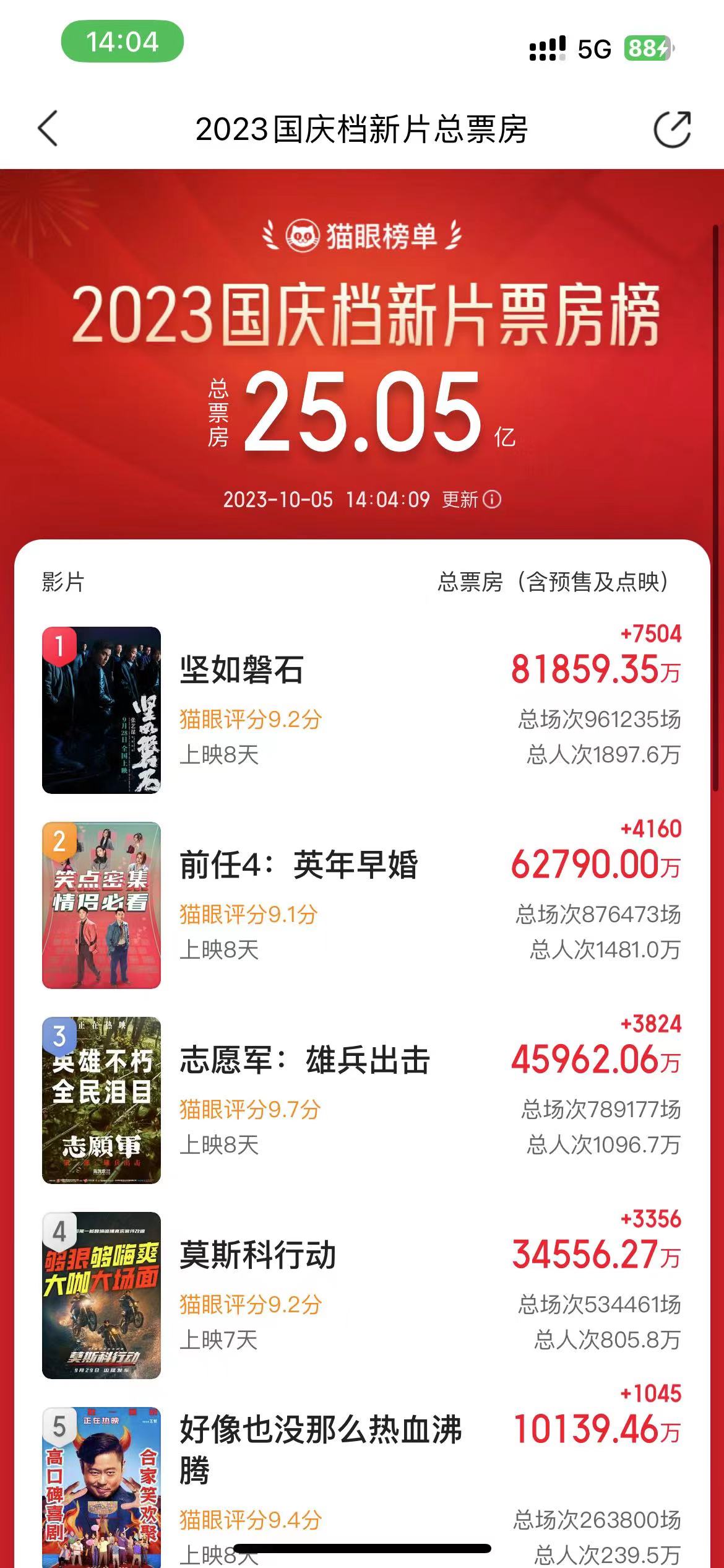 (大公文匯網 記者 郭瀚林 北京報道)據貓眼、燈塔等平台數據,內地國慶檔(9月29日-10月6日)電影累計票房在5日下午突破25億元(人幣,下同)。此次國慶檔內地院線共推出12部新片,數量達近年之最,題材涵蓋戰爭、動作、愛情等多種類型,為觀眾提供了豐富的觀影選擇。截至發稿,《堅如磐石》以8.18億元暫居首位,第二、三、四名分別是《前任4:英年早婚》《志願軍:雄兵出擊》和《莫斯科行動》,四部片均為國產新作。今年火熱的暑期檔之後,內地電影市場普遍對疫情後的首個國慶檔予以厚望,不過目前來看,國慶檔票房成績應難以實現大幅突破。