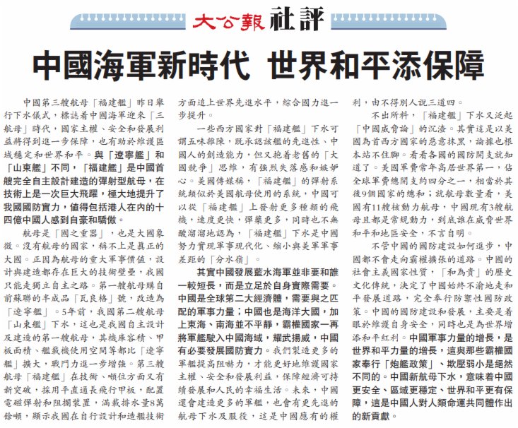 中國第三艘航母「福建艦」昨日舉行下水儀式,標誌着中國海軍迎來「三航母」時代,國家主權、安全和發展利益將得到進一步保障,也有助於維護區域穩定和世界和平。與「遼寧艦」和「山東艦」不同,「福建艦」是中國首艘完全自主設計建造的彈射型航母,在技術上是一次巨大飛躍,極大地提升了我國國防實力,值得包括港人在內的十四億中國人感到自豪和驕傲。