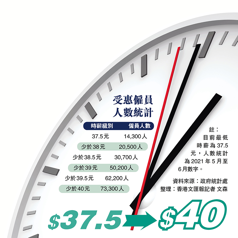 (香港文匯報 記者 劉明、廣濟、費小燁)香港超過3年未曾調整的法定最低工資水平明年有望上調,有消息稱最低工資委員會已達成共識,最低工資的時薪將由現時37.5元上調至40元,行政會議通過後會於明年5月起實施,約7.3萬名低薪僱員獲加人工,比現時領取最低工資僱員1.4萬人,增約6萬人。有低薪僱員表示,今次加薪太遲,只夠抵消過去3年的通脹。房屋署外判清潔工亦表示加幅太少,不少有家累的工友生活仍捉襟見肘。有物管人員接受香港文匯報訪問則表示,6.67%加幅聊勝於無,更有不少物業保安員寧願轉做散工,犧牲強積金及假期等福利,賺取超過40元的時薪。