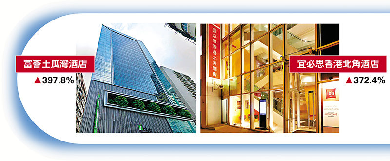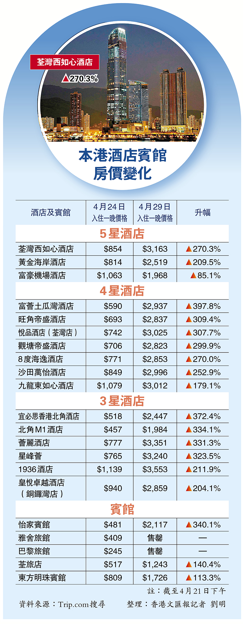 香港文匯報連日來在旅遊網站Trip.com搜尋及統計不同地區的三星以上酒店房價的變化。以6間三星酒店為例,勞動節前一兩天入住的房價比平日貴兩三倍,如北角一間酒店,若有兩名成人於明天(24日)入住,一晚房價最低518元,而愈近勞動節房價愈貴,本月29日內地黃金周開展時,房價高見2,447元,即房價較平日升超過3.7倍,就算是位處將軍澳的三星級酒店,黃金周期間房價也較平日升超過3.2倍。