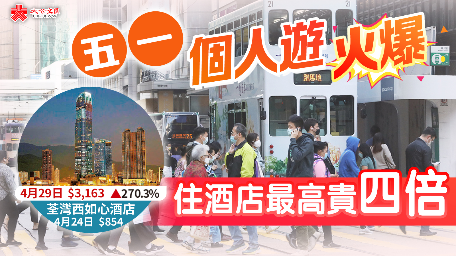 (香港文匯報 記者 劉明)距離內地五一黃金周尚餘約一個星期。面對香港與內地全面恢復正常通關後的內地首個黃金周,香港旅遊業的吸客攻勢進入衝刺階段,香港文匯報連日統計發現,愈近勞動節假期,香港酒店房價愈是「海鮮價」,如內地五一長假期開展首天,多區酒店房價較平日最多升近四倍。新任香港酒店業主聯會執行總幹事徐英偉日前在接受香港文匯報專訪時解釋,大批內地旅客其間將以個人遊方式訪港,全港酒店平均預訂率高達七成,酒店房價因而被扯高,但升幅仍在可接受範圍內。有舉辦入境旅行團的旅遊業人士坦言,房價三級跳,加上旅遊巴等成本,五一入境團團費上揚,影響旅行社收客,估計五一團客較疫情前流失三四成。