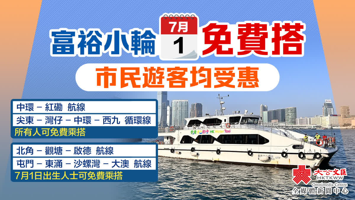另外,凡7月1日出生的市民及遊客,於生日當日可免費乘搭「北角-觀塘-啟德」及「屯門-東涌-沙螺灣-大澳」渡輪航線。