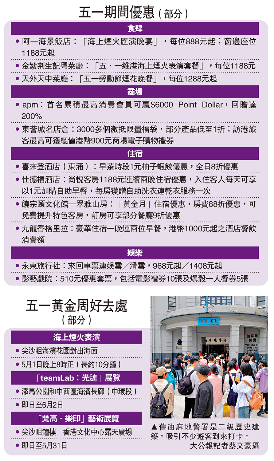 (大公報記者 劉碩源)內地的五一黃金周五日假期,將於下周三起展開,旅遊業預計將有80萬內地旅客來港,按年增三成。旅遊發展局將於五月一日舉辦維港煙火,本地酒店、商舖近日紛紛推出主題優惠或套餐,有海景餐廳推出五一煙火套餐,有船公司推出海上自助晚餐及煙火表演套票,已有逾百人預訂登船。