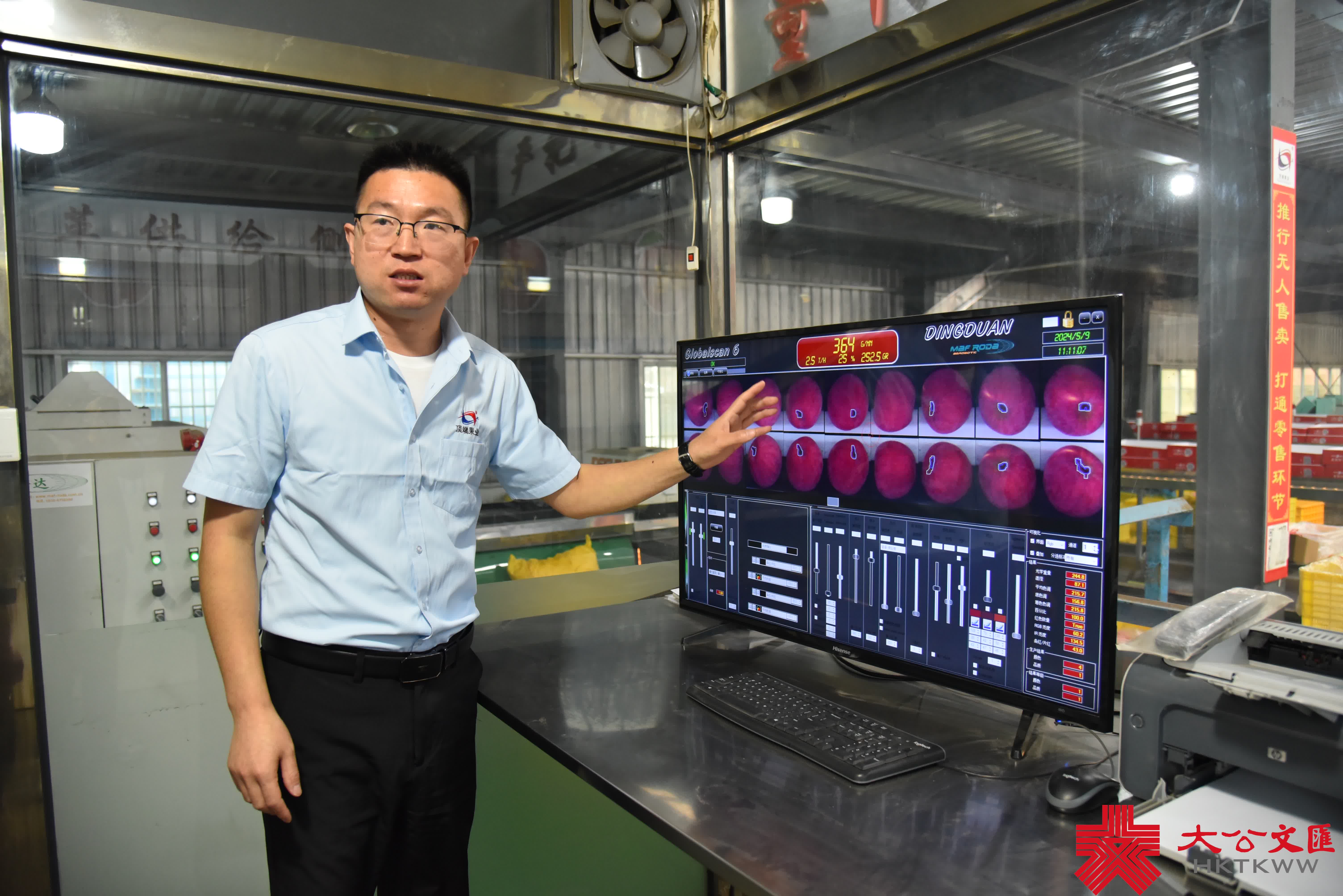 「好蘋果是種出來的,也是選出來的。」延安自然搭檔農業發展有限公司在洛川有3條蘋果分選線,每天可分選鮮果60萬斤以上。公司總經理方浩告訴記者,分選線會按照外觀和內在兩個品質進行分選。其中,顏色、果型、大小有瑕疵的,會首先篩選掉,然後便看內在。「通俗講,就是給蘋果照個CT,一秒鐘可以拍21張照片,內在瑕疵都能檢出來。」方浩表示,通過兩道篩選,基本上可以達到99%的正確率,保證到消費者手裏的都是「健康」和脆甜多汁的果子。