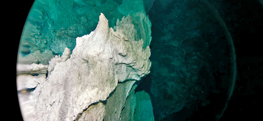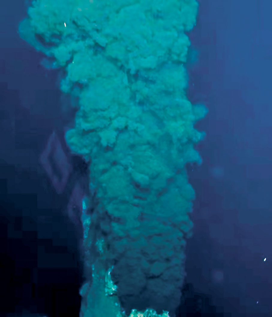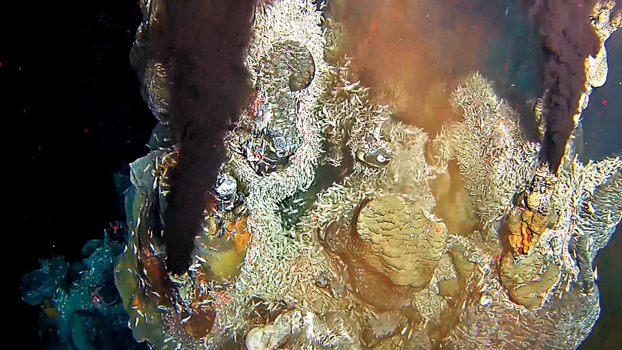 地區內有隨時會噴出熾熱溶液的黑煙囪,儘管概率很低,但有一次「蛟龍號」還是一不小心鑽到「黑煙囪」裏——這種「黑煙囪」實際上是海底火山正在噴發,有着接近400度的高溫,鑽進去後即使打開燈光,周圍也是漆黑一片,可謂伸手不見五指。