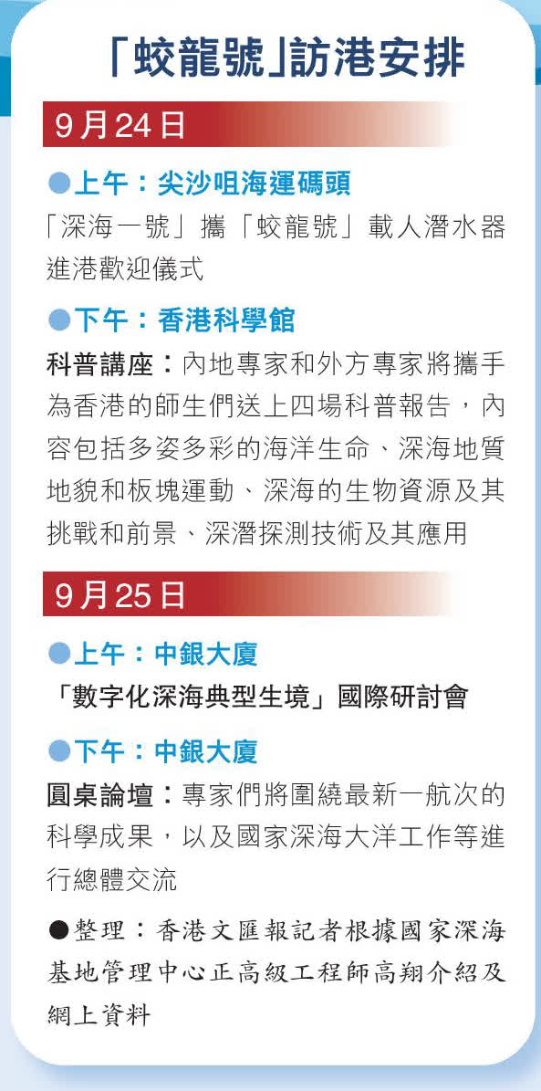 23日至25日,返航途中的「蛟龍號」將首次停靠香港,兩地深海研究的合作交流亦將進一步深化。許學偉表示,未來「海洋十年」大科學計劃「數字化深海典型生境」計劃在印度洋開展第二個國際航次,希望更多香港科學家參與其中。