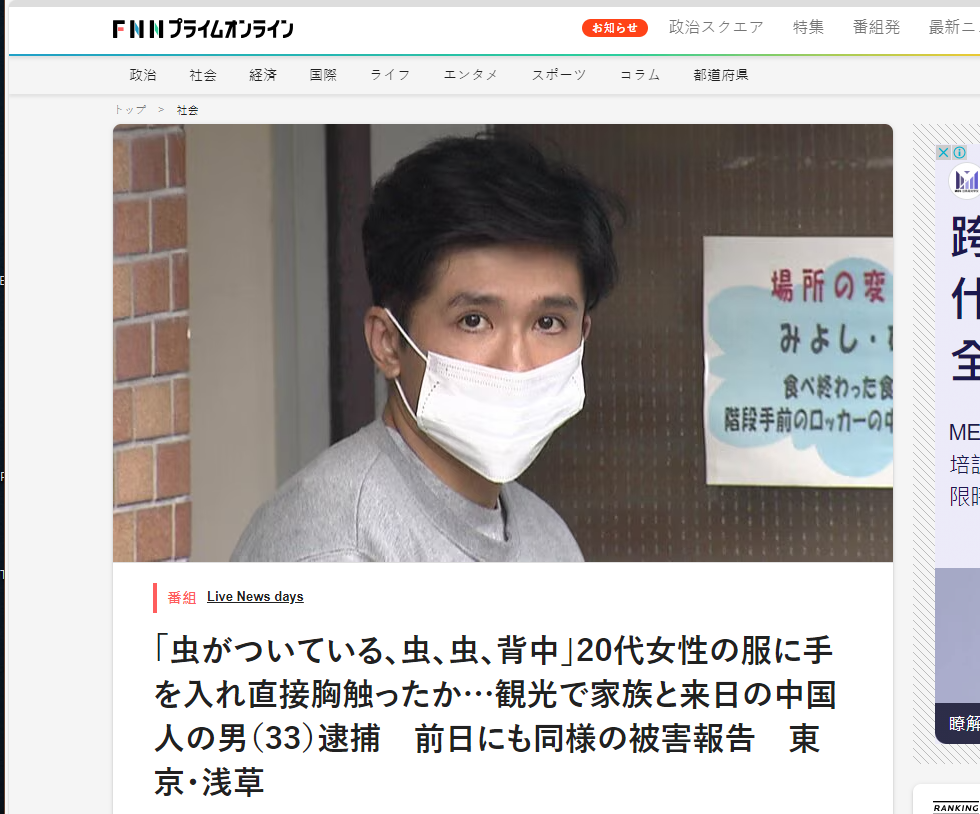 大公文匯全媒體報道,據日媒報道,今年6月在東京淺草的某個商圈,33歲港男張偉雄以對方「身上有蟲」為藉口,涉嫌非禮向一名20歲夜歸日本女子,受害人不甘受辱報警,惟翌日張偉雄馬上離開日本,一直逍遙法外。前日(5日)他再度入境時被日本警方拘捕。