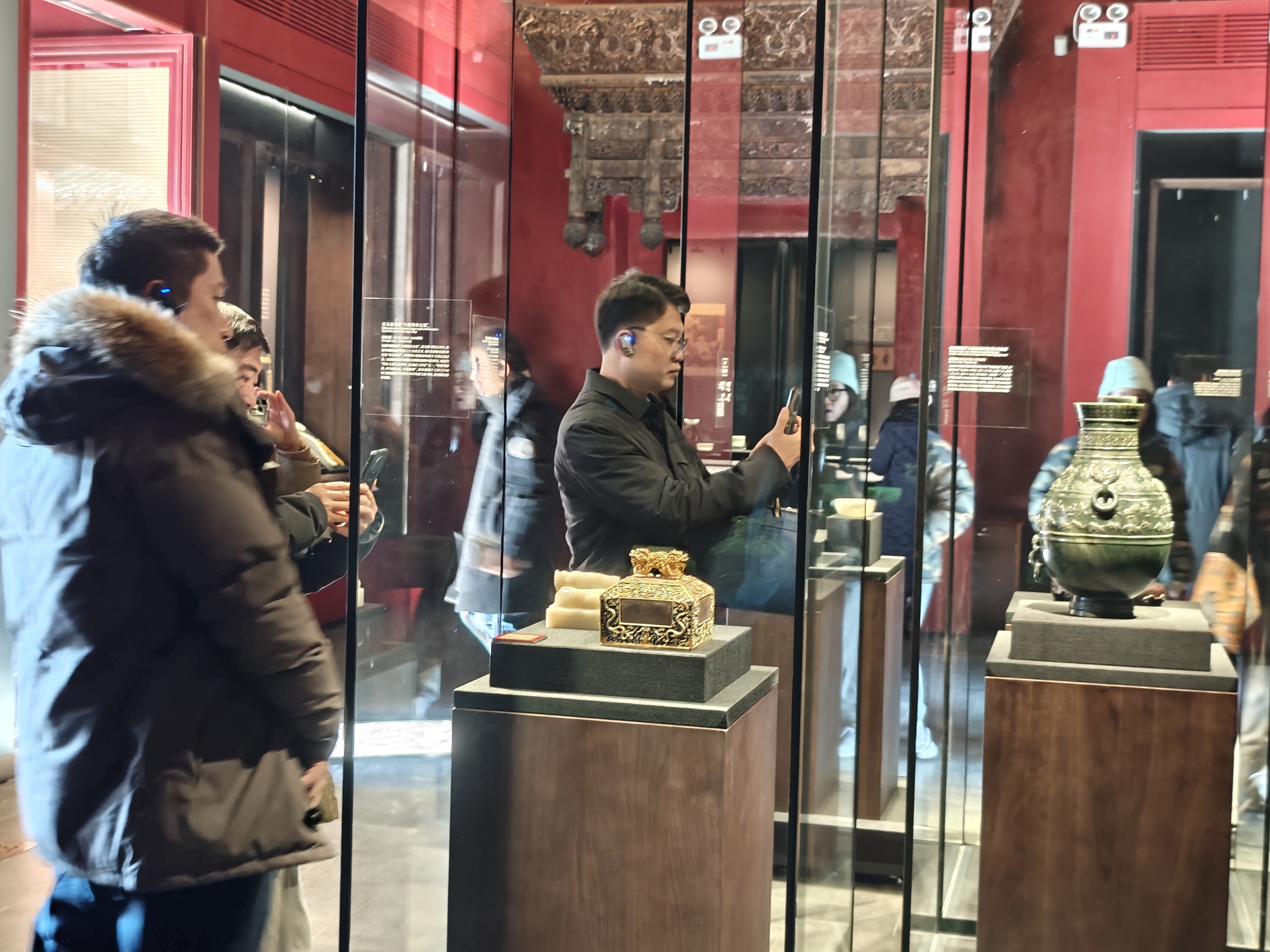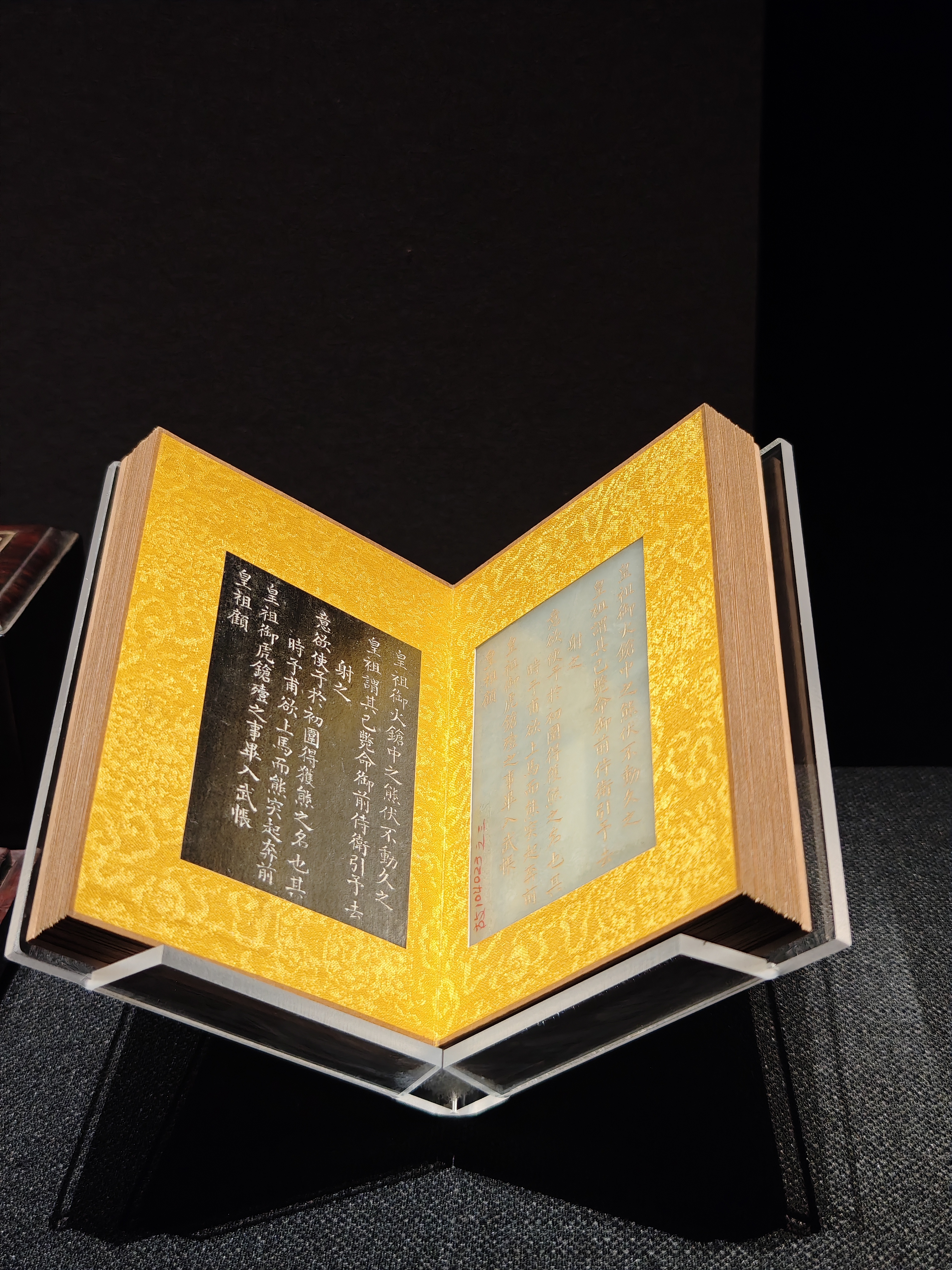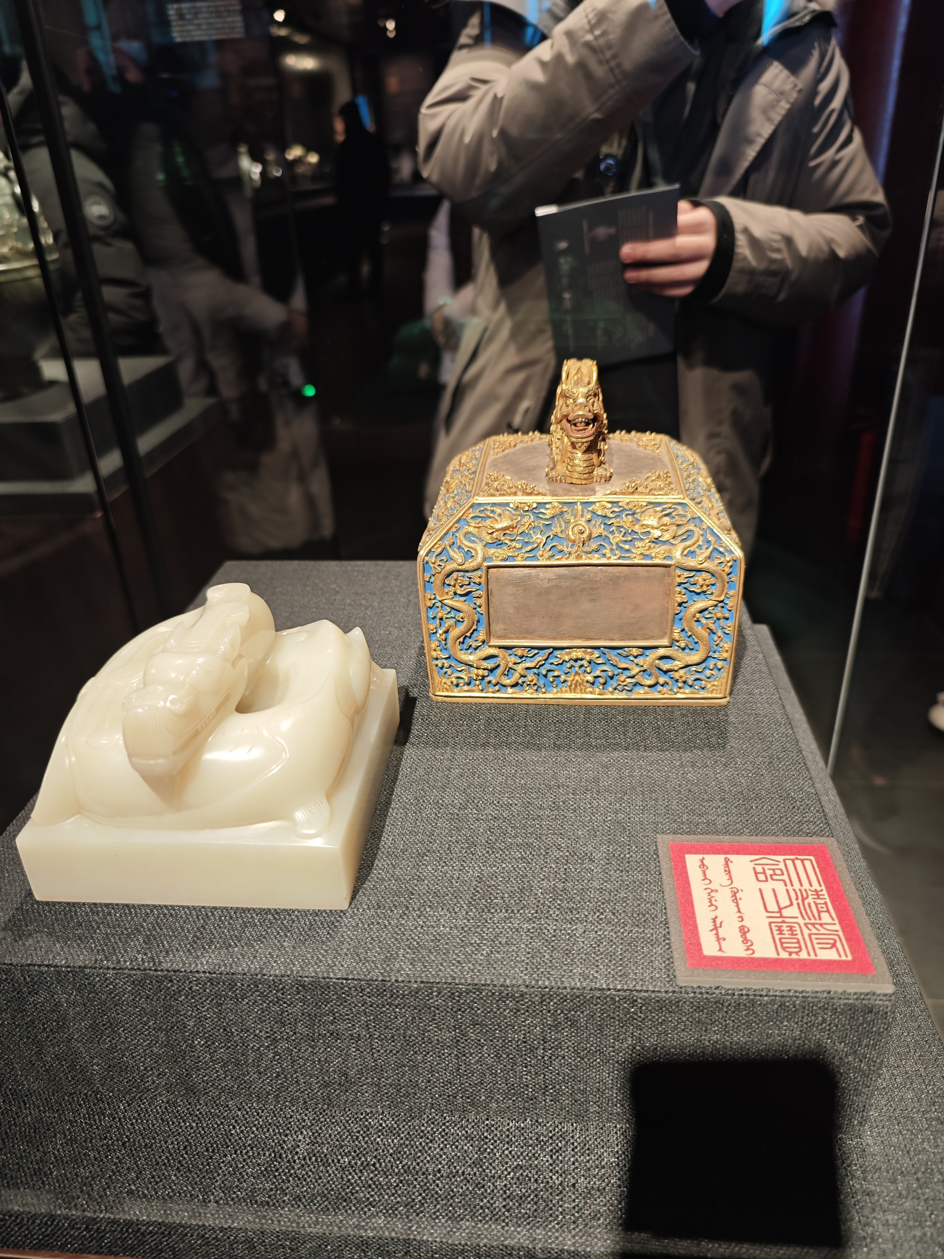 「絕大部分展品是清宮舊藏,最具代表性的一件是白玉盤龍鈕『大清受命之寶』。我們特意把它放在一進展廳的獨立展櫃裏,方便觀眾欣賞。」黃英說,寶璽呈方形,盤龍鈕,印面陽刻「大清受命之寶」,漢文篆書滿文本字,各二行。這是乾隆皇帝欽定二十五寶之首,據《交泰殿寶譜》所記為「以章皇序」,即表明大清皇帝受命於天的正統身份。《御題交泰殿寶譜序後》中記載,它是「傳自太宗文皇帝時,自是而上四寶」之一,「均先代相承,傳為世守者,不敢輕易」。所以在乾隆十三年詔改璽印中的滿文本字為滿文篆書時,該寶得以保持原貌。