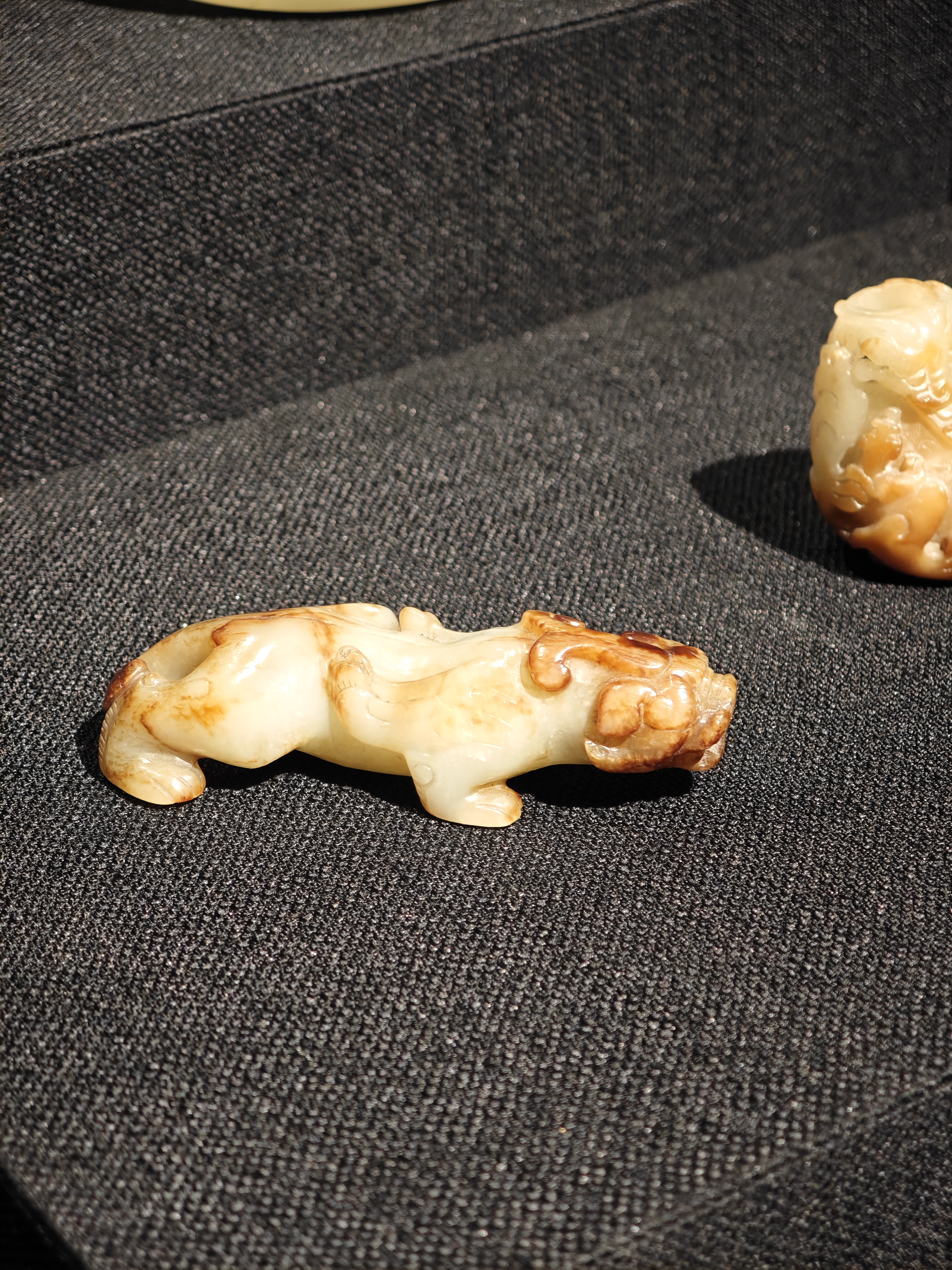 另有一件白玉辟邪的年代可以追溯至漢代,是故宮收藏最早的和田玉籽料器。黃英介紹,傳說辟邪是一種能驅走邪穢的神獸,原型為產於西亞、北非等地的獅子。西漢時期,這種動物隨着絲綢之路的開通傳入中國,並與傳統翼獸結合,衍生出具有中國特色的神獸——辟邪。此件辟邪與陝西渭陵遺址出土的一件玉辟邪非常相似。