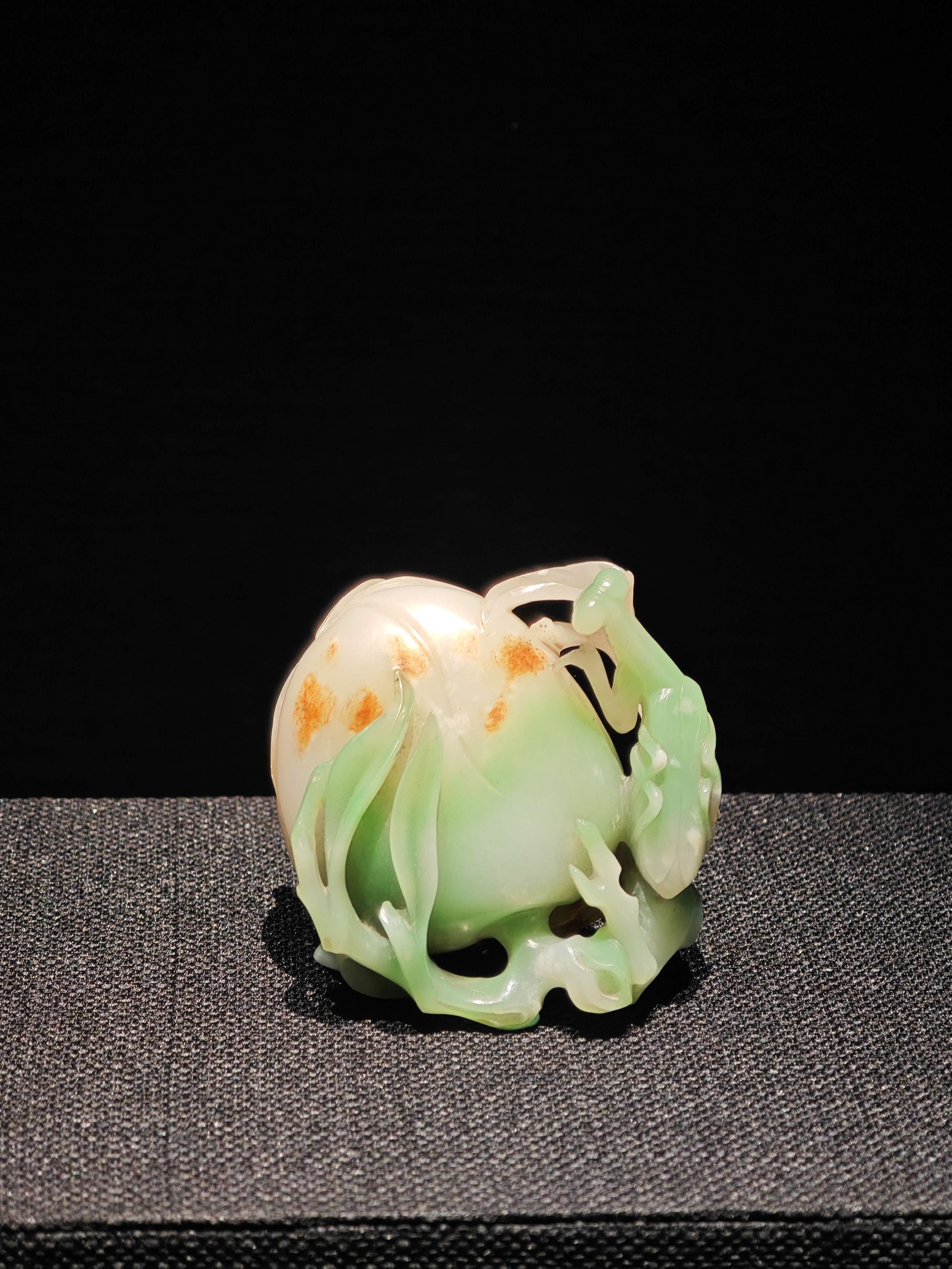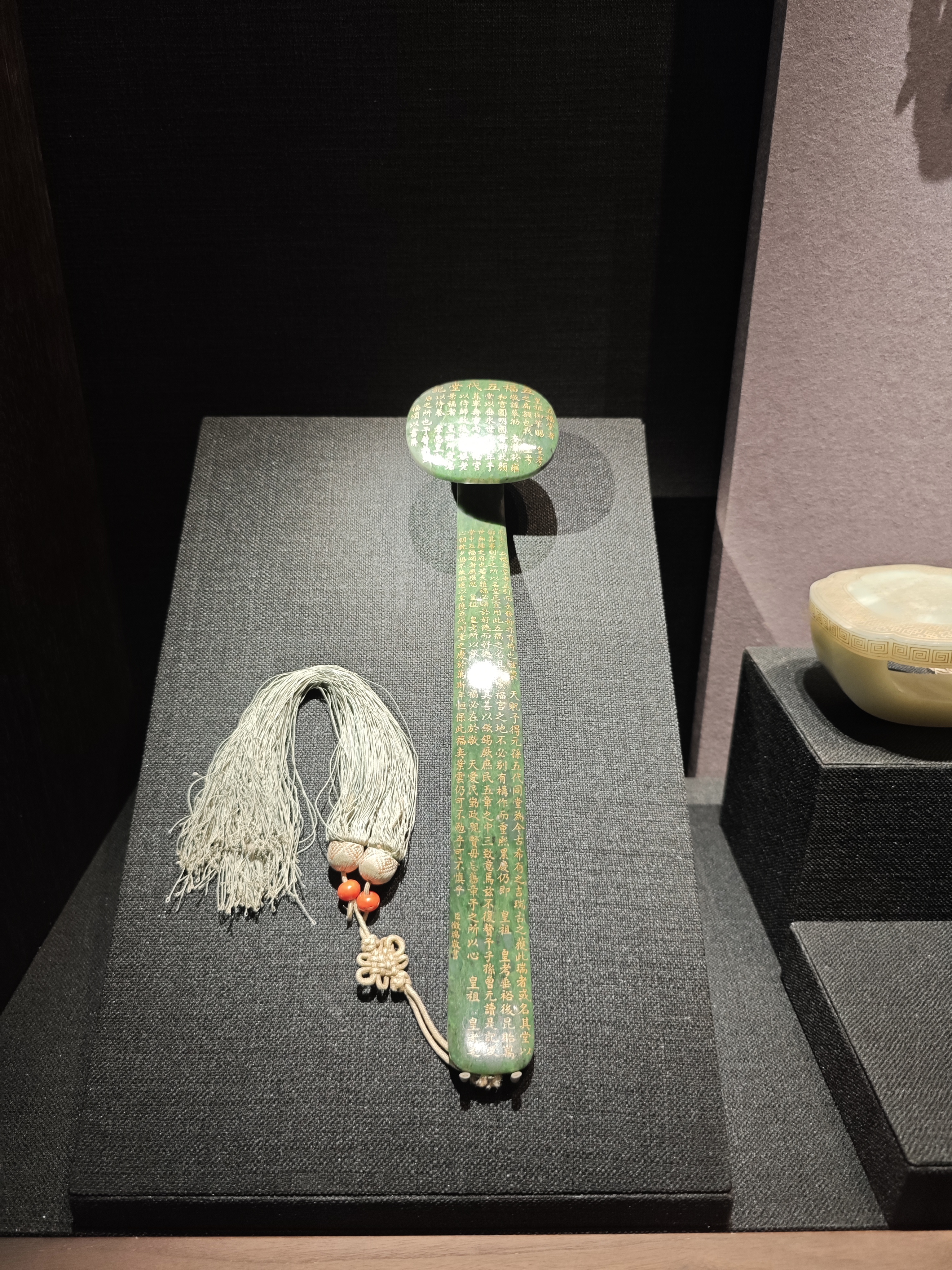 展覽還精選了5件玉如意,在玉料的顏色上與第一單元的「玉具五色」相呼應,其中一件乾隆御題青玉如意,長56厘米,寬12.7厘米,為故宮博物院現藏玉如意中體量最大者。據悉,故宮博物院現藏玉如意800餘件,以乾隆時期玉如意數量最多。清代宮廷玉如意選材精良、雕琢細緻、寓意吉祥,主要以龍、鳳、蝙蝠、壽字、捲雲、靈芝、萬年青、蓮瓣、牡丹、松樹、桃實、梅花等吉祥紋飾或組合紋飾為題材。