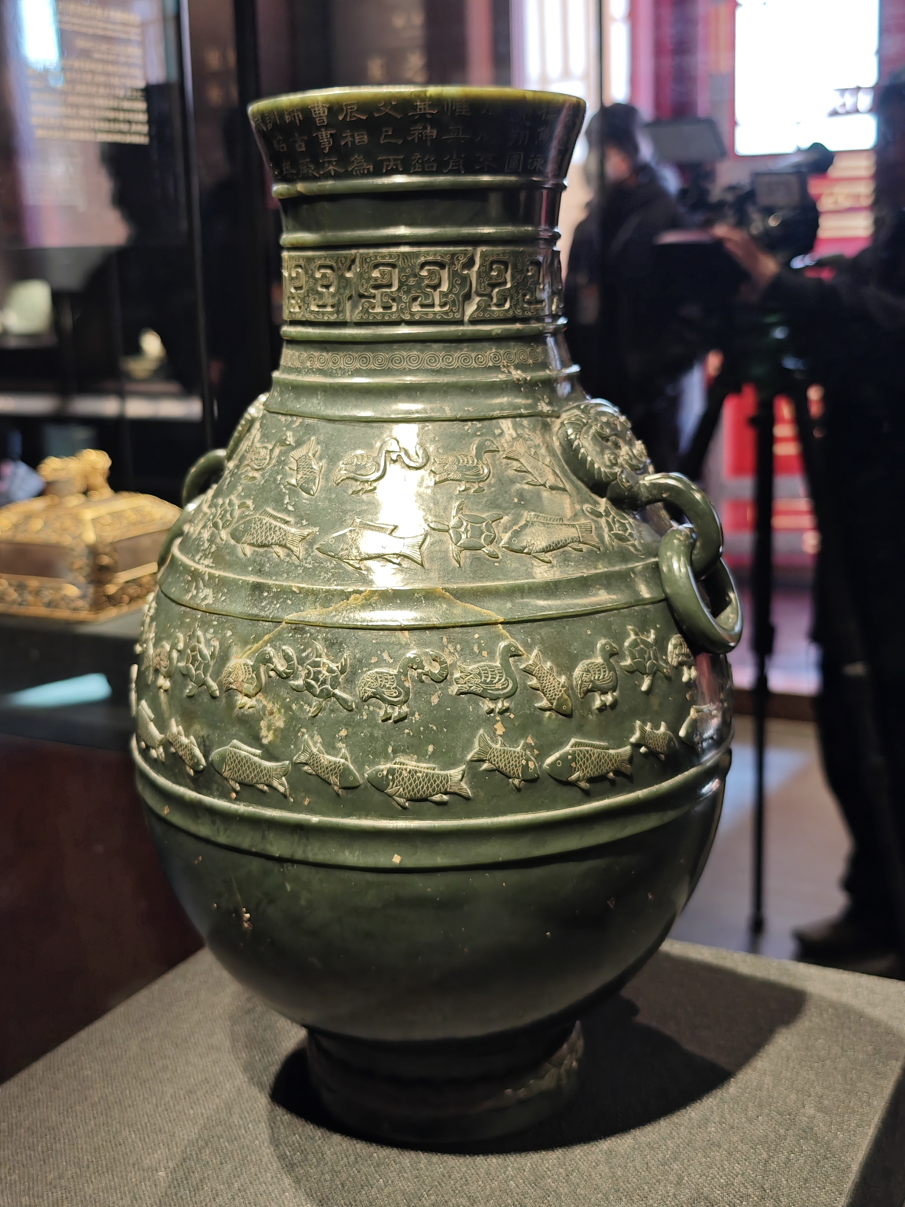另據介紹,乾隆喜愛以玉仿製青銅器。一件乾隆御題青玉百獸紋豆,復刻了周百獸豆。因為器蓋及器身已經滿飾淺浮雕百獸及獵人,喜好題字蓋戳的乾隆最終選擇在玉豆蓋內鐫刻御制詩《詠和闐綠玉百獸豆》。