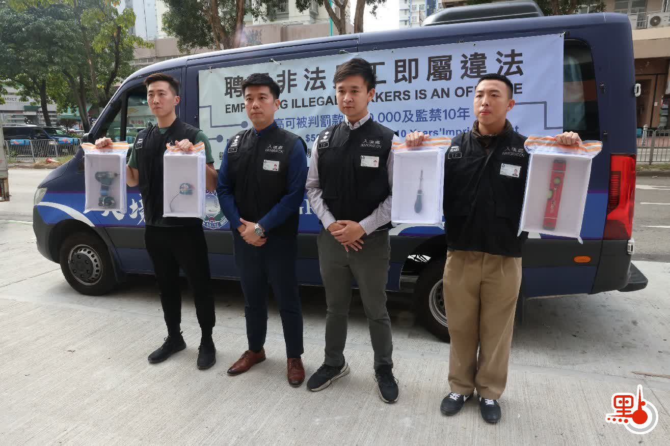 (大公文匯全媒體 記者 蕭景源)年近歲晚,入境處預計有非法勞工藉農曆新年前「搵快錢」,以旅客身份來港從事非法裝修或清潔工作。經深入調查及情報分析後,入境處特遣隊人員上周起至昨日(7日)在全港多區展開反非法勞工行動,突擊巡查88個目標住宅單位及商戶等處所,拘捕26名非法勞工及3名涉案僱主,另檢獲涉案的電鑽、鐳射水平尺及捲尺等。