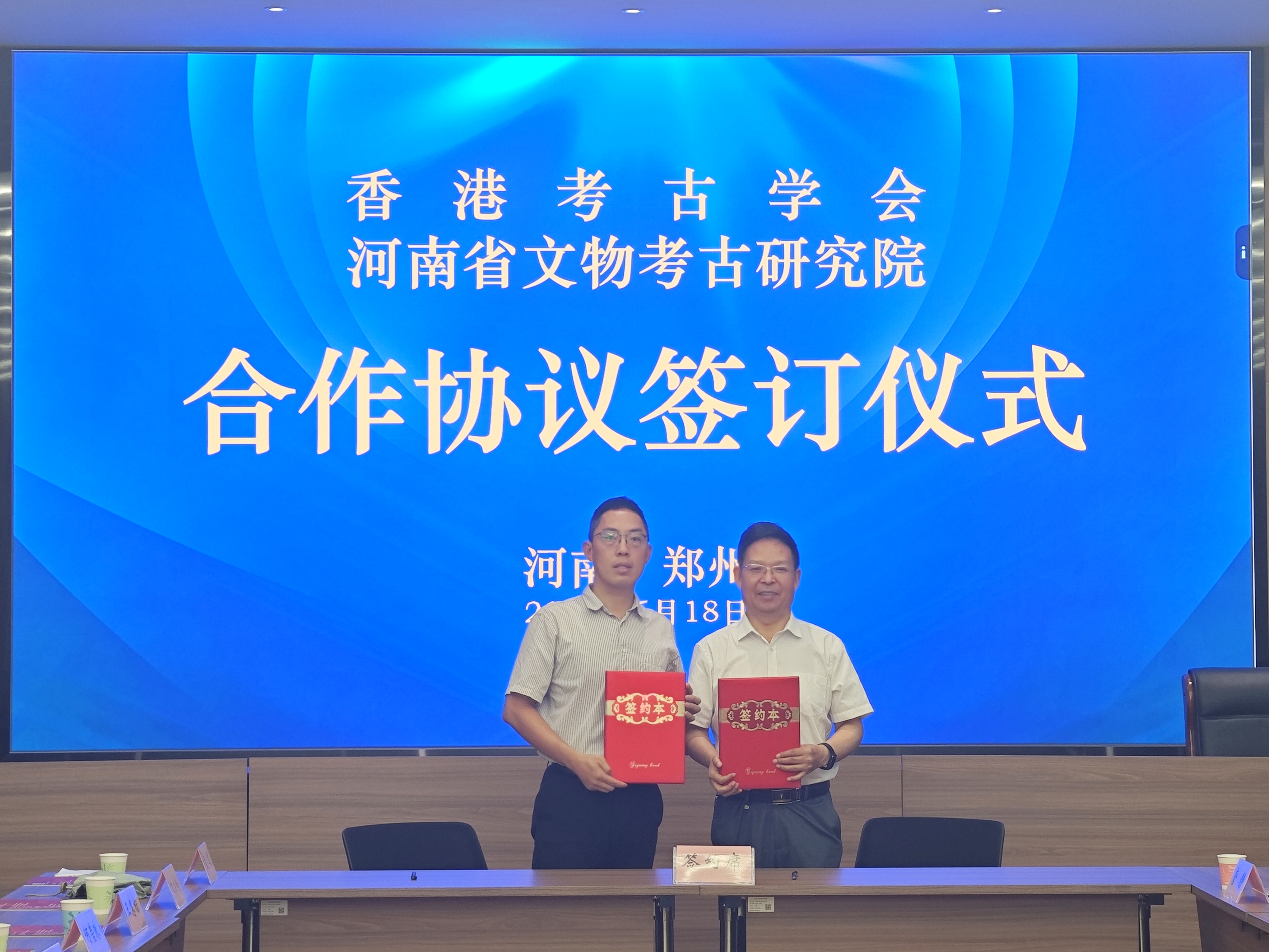 為響應中央對考古的重視,2025年6月18日,香港考古學會(以下簡稱考古學會)主席蔣白浪一行到河南省文物考古研究院進行訪問交流,院黨委書記劉海旺、副院長梁法偉及相關部門負責人出席交流。活動中,考古學會與河南省文物考古研究院簽訂了合作協議。此合作將會深化豫港雙方在考古學術交流、文物保育、考古學公眾推廣等多個方面的合作與交流。同時,與會成員有幸得到河南省文物考古研究院的熱情招待,由當地考古工作者帶領參觀文物展覽及文物科技保育中心,考察當地最新的考古成果。