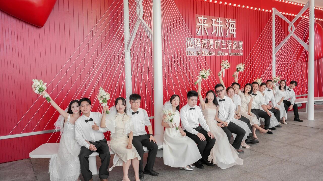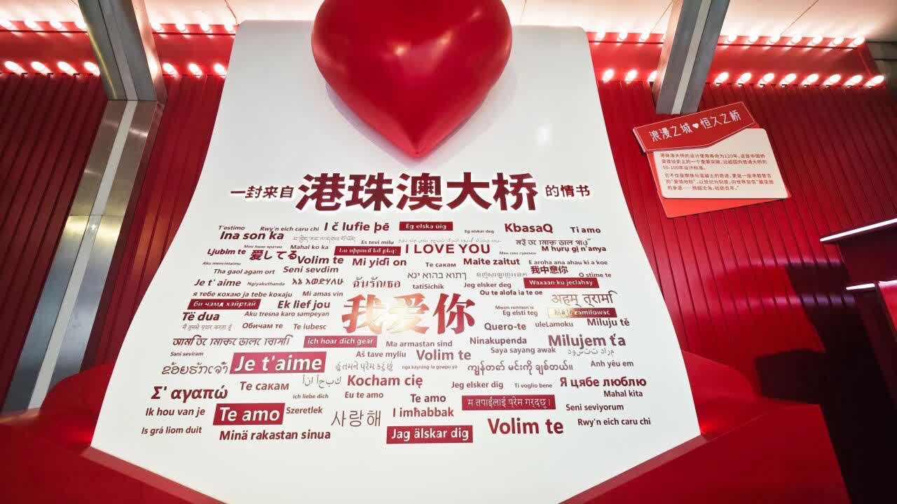 步入港珠澳大橋珠海口岸的「遇見大橋」廣場,旅客瞬間被巨型「港珠澳大橋情書」藝術陳設吸引。99種語言書寫的「我愛你」與旁邊的以大橋斜拉索為靈感的白色裝置蜿蜒相映,「來珠海,選擇浪漫的生活態度」標語映襯着紅牆,吸引眾多旅客紛紛駐足打卡。當天,8對新人在民政部門的現場頒證下,將浪漫氛圍推向高潮。