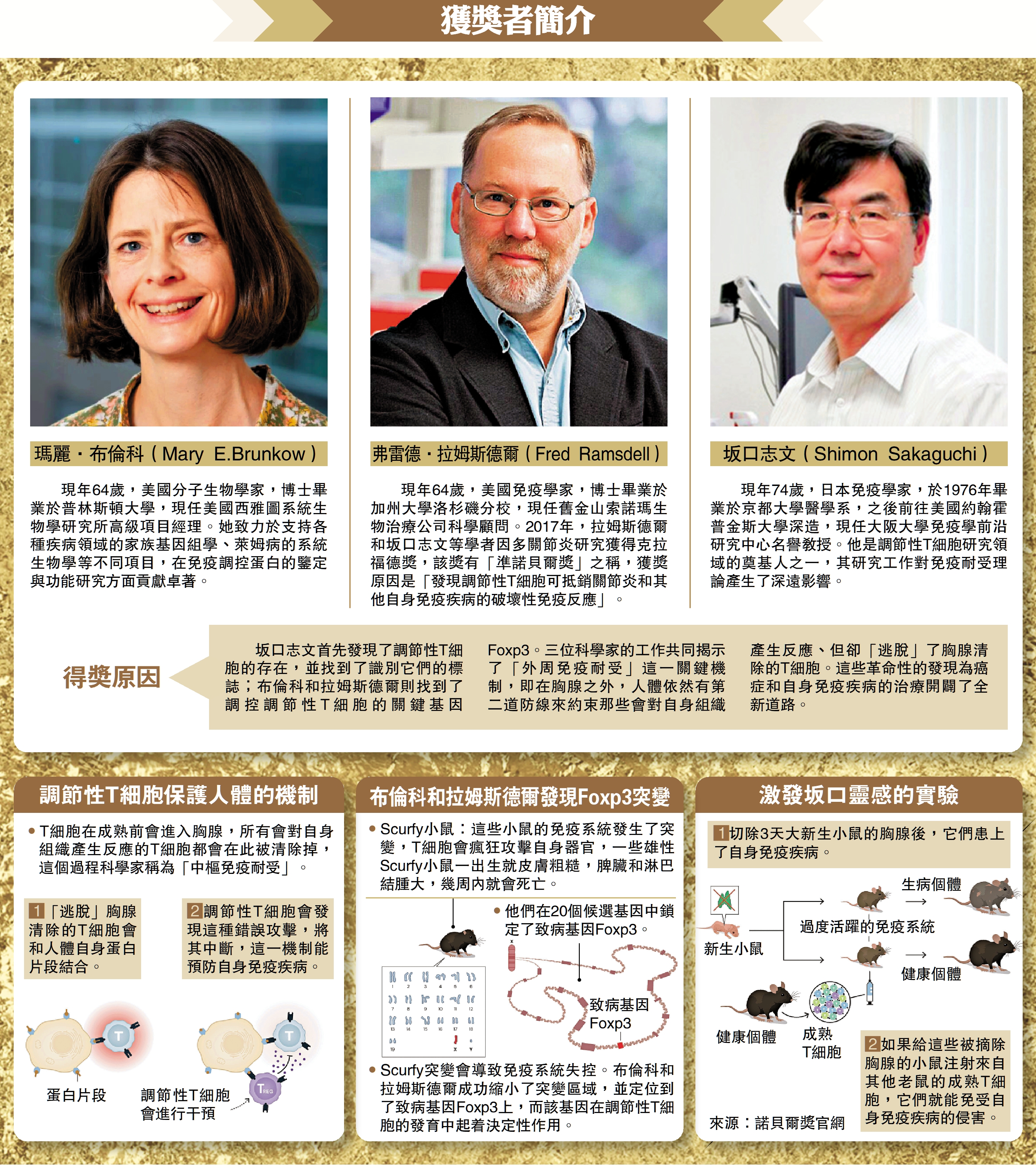 大公報綜合報道,瑞典卡羅琳醫學院6日宣布,將2025年諾貝爾生理學或醫學獎授予美國科學家布倫科、拉姆斯德爾,以及日本科學家坂口志文,表彰他們在外周免疫耐受方面的研究貢獻。諾貝爾獎委員會稱,三位獲獎者共同發現並定義了免疫系統中關鍵的「安全衛士」─調節性T細胞,不僅深刻改變了人們對自身免疫系統如何保持平衡的理解,也為治療自身免疫疾病、提升治療癌症療效以及防止器官移植排斥反應帶來了新的策略。