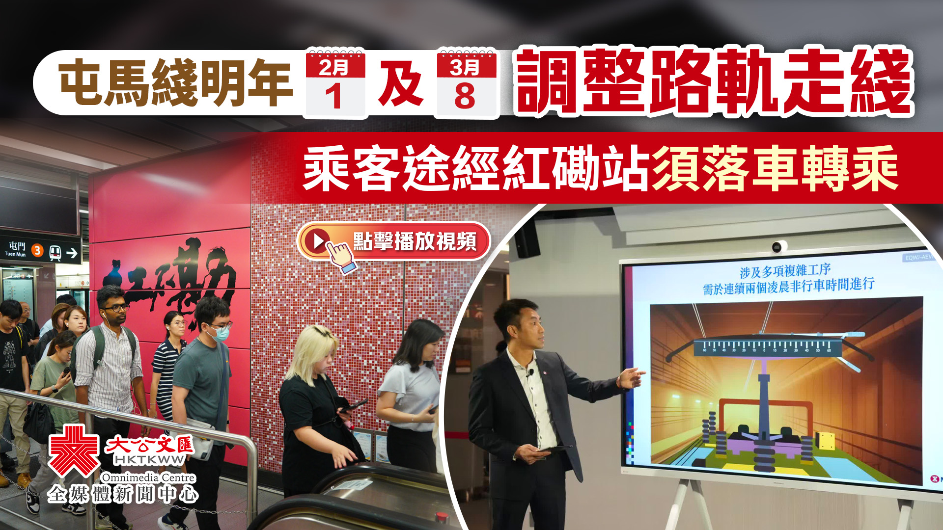 (大公文匯全媒體 記者 王俊傑)港鐵今日(17日)宣布,紅磡站至尖東站之間將進行路軌改道跟進工序,屆時短暫封閉部分路段,屯馬綫將於明年2月1日及3月8日實施特別服務安排。港鐵強調,會維持全綫列車服務,大部分乘客車程如常,只有車程途經紅磡站的乘客需要在該站下車,前往對面月台轉車繼續行程。