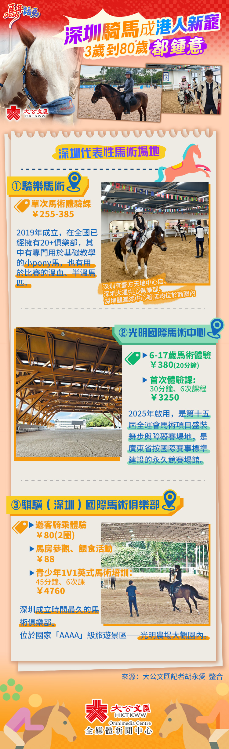 (大公文匯網 記者 胡永愛、李薇 深圳報道)馬年騎馬,不僅是一種應景的風潮,更是傳統文化的傳承與延續。臨近春節的周末,記者走訪深圳多個馬術俱樂部時看到,滿場幾乎都是來騎馬的港客,他們多已在此學習或練習多年,固定每月或每周1-2次,年齡從3歲跨越至80多歲不等。來深圳騎馬,不僅成為馬年之下北上的新潮消費選擇,更已成為愛馬、愛馬術的港客們的日常生活的重要組成部分。
