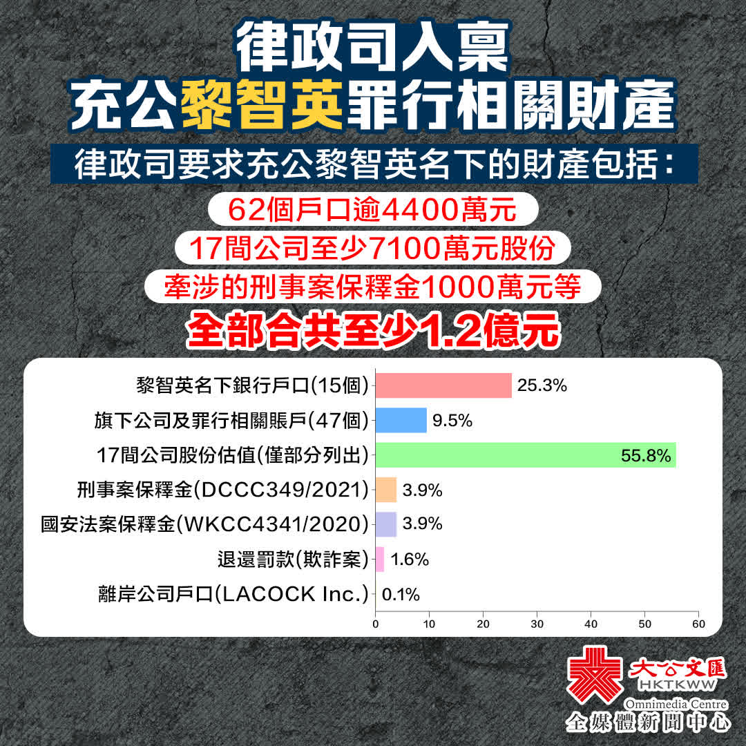 律政司入稟充公黎智英罪行相關財產 涉62戶口17公司股份等至少1.2億元